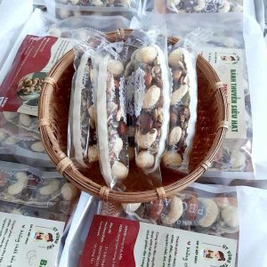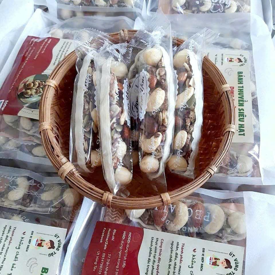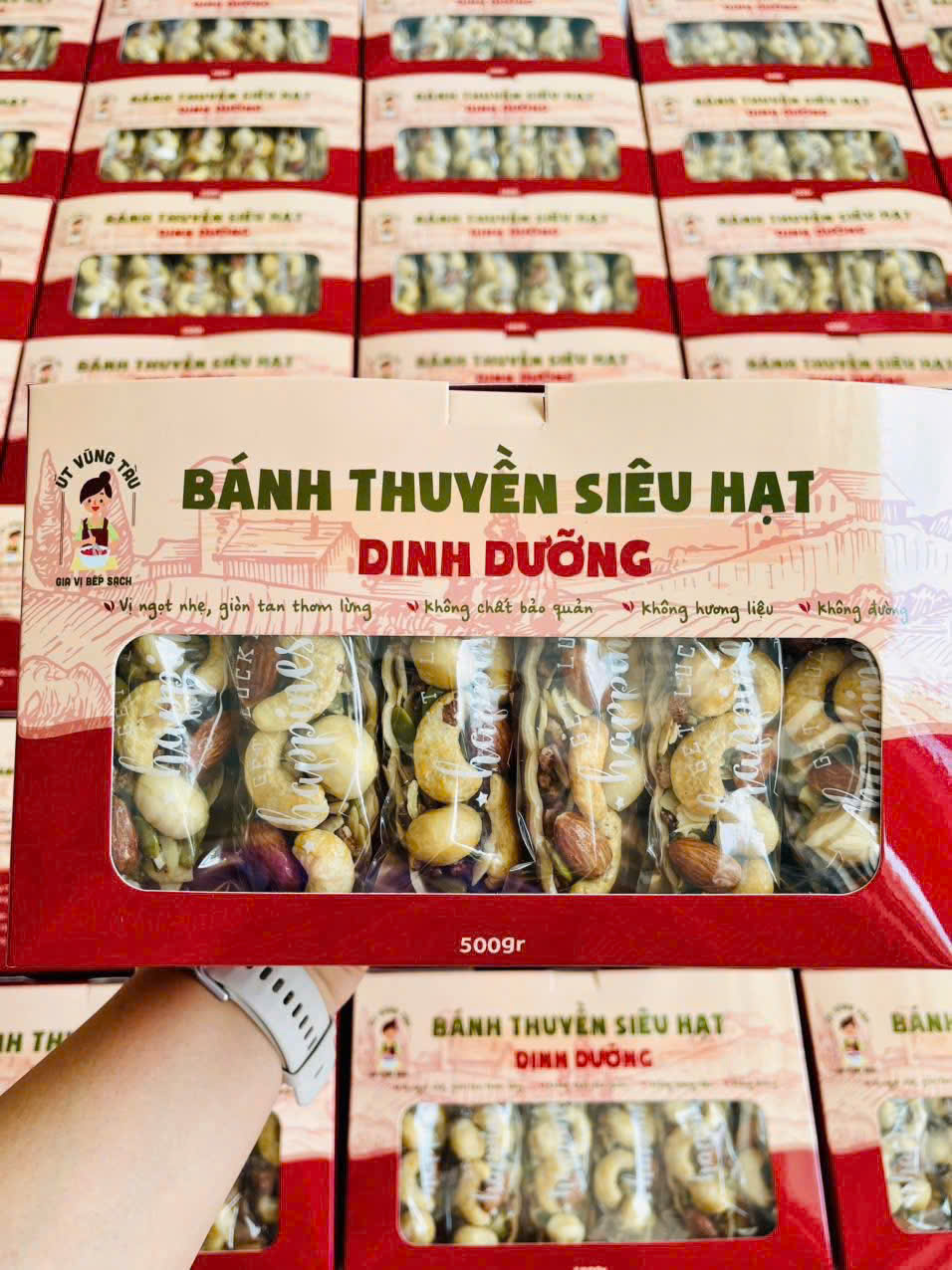 Bánh thuyền siêu hạt của Bếp Út là sự hòa quyện giữa các loại hạt giàu dinh dưỡng như hạnh nhân, hạt chia, hạt điều và mè đen. Mỗi chiếc bánh được nướng giòn, giữ nguyên hương vị và dưỡng chất từ các loại hạt. Sản phẩm không chỉ là món ăn vặt ngon miệng mà còn cung cấp năng lượng, chất xơ, và các chất béo có lợi cho sức khỏe. Bánh thuyền siêu hạt phù hợp cho mọi lứa tuổi, từ người lớn đến trẻ em, và đặc biệt lý tưởng cho những ai đang tìm kiếm bữa ăn nhẹ lành mạnh.